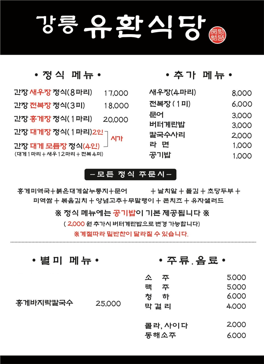 생생정보에 소개되는 유환식당 대표 메뉴는 당연히 간장홍게장 정식이죠! 신선한 꽃게를 써서 짜지 않고 감칠맛이 끝내준대요. 간장새우장, 간장전복장, 간장홍게장 등 다양한 메뉴도 있고, 가격은 1인분에 17,000원에서 20,000원 정도예요.