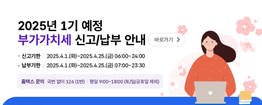 부가세 납부와 함께 부가세 신고도 필수죠! 2025년 부가세 신고는 4월 1일부터 4월 25일까지예요. 방법은 아래와 같아요.