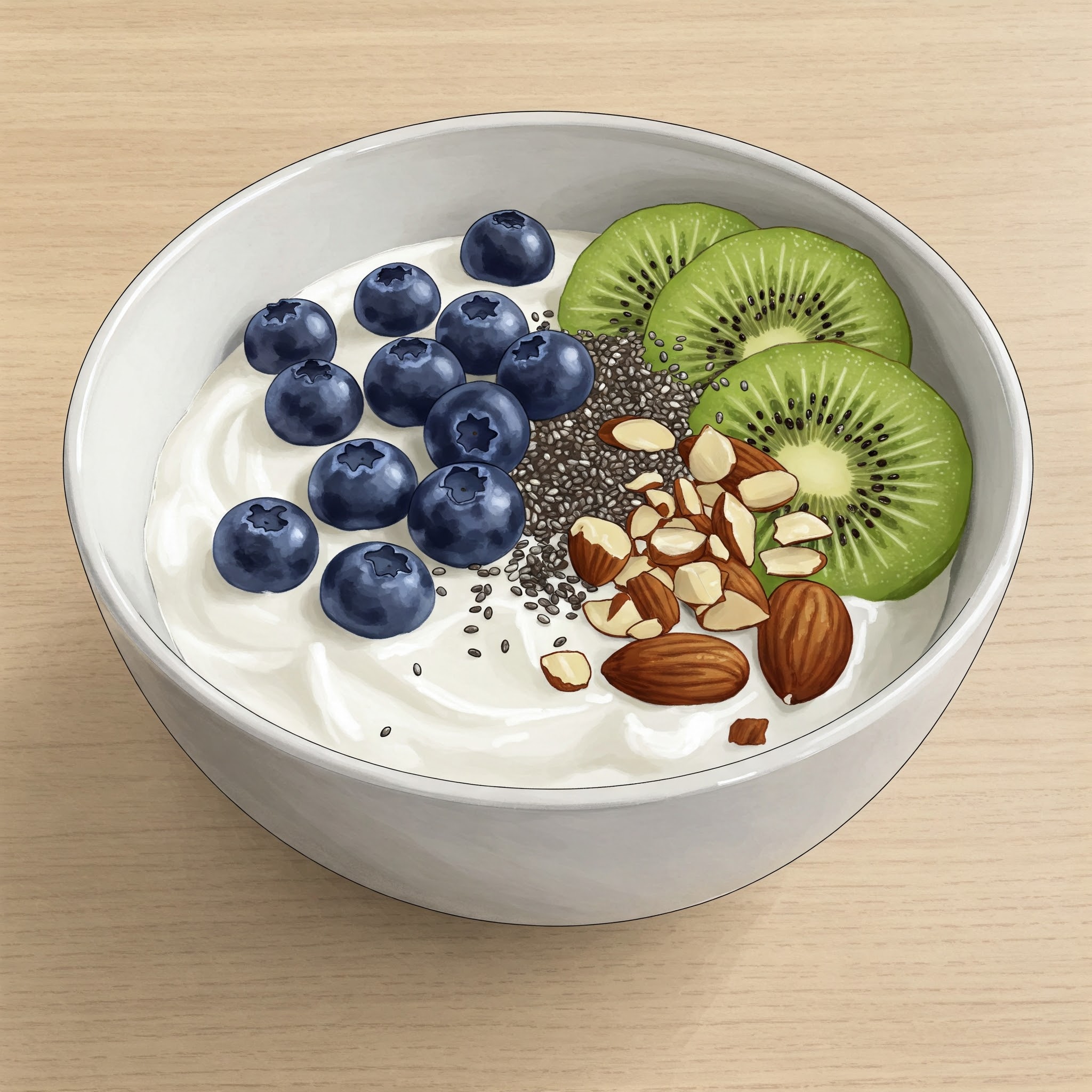 - 재료 (1인분): 무가당 그릭요거트 150g, 블루베리 1/4컵, 키위 1/2개, 아몬드 5알, 치아씨드 1작은술