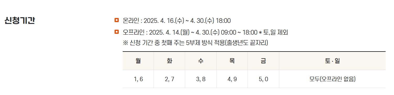 - 5부제: 4월 16일~19일은 출생년도 끝자리에 따라 신청 가능