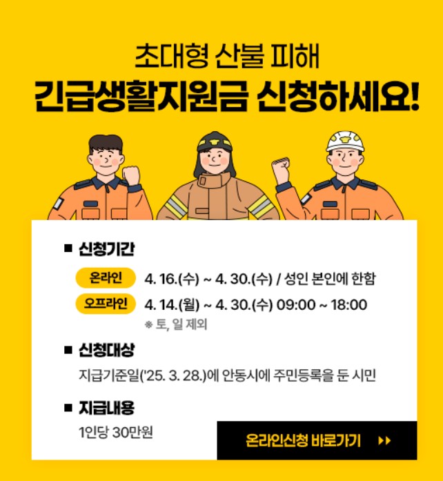안동 산불 재난지원금은 온라인과 오프라인 두 가지 방법으로 신청할 수 있습니다. 신청 기간은 2025년 4월 14일(월) ~ 4월 30일(수)입니다.