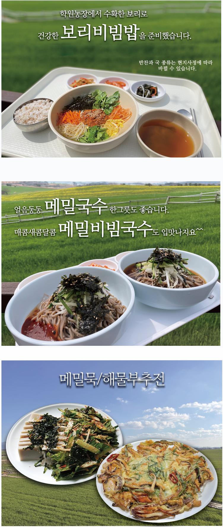 축제장 중앙밭 바로 앞에 위치한 이곳은 수요미식회에 소개된 명소예요. 학원농장에서 수확한 보리로 만든 보리비빔밥(11,000원)은 신선한 채소와 고소한 보리의 조화가 일품이죠. 메밀물국수(10,000원)와 해물부추전(18,000원)도 인기 메뉴! 청보리 시즌(3월 말~5월 말)에만 운영되니, 놓치지 마세요. 고창 청보리밭 축제 입장료가 없는 대신 학원 농장에서 식사 해 보시는 건 어떨까요?
