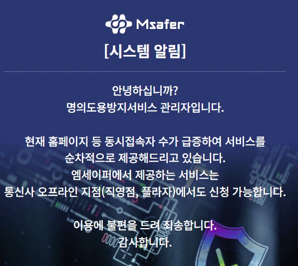 가장 정석적인 명의도용방지 서비스 신청 방법은 Msafer 공식 웹사이트를 이용하는 것입니다.