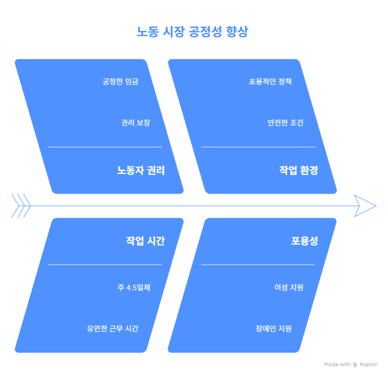 교육·경제·복지 분야에서 이재명 대선 공약은 자영업자, 플랫폼 노동자 등 모든 노동자의 권리를 보장하겠다고 약속했습니다. 포괄임금제 금지, 주4.5일제 도입, 고용평등 임금공시제는 노동 환경 개선의 핵심입니다.
