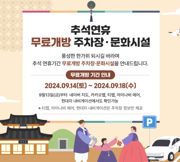 이번 추석 연휴에는 가족과 함께 무료 개방되는 문화시설과 공공주차장을 이용하여 뜻깊은 시간을 보내시기 바랍니다. 전통문화 체험과 지역 경제 지원을 통해 더욱 의미 있는 연휴를 만들어 보세요. 즐거운 추석 되세요!