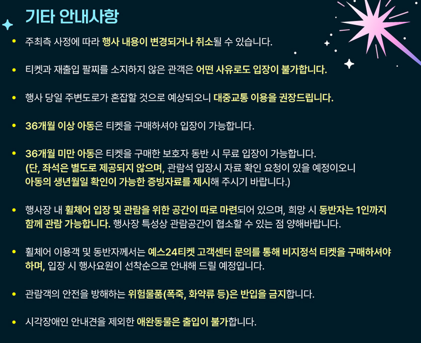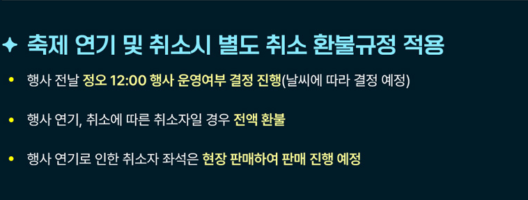행사 전날 정오 12:00에 행사 운영 여부가 결정되며, 행사 연기 또는 취소로 인한 취소자는 전액 환불됩니다. 행사 연기로 인해 취소된 좌석은 현장에서 판매될 예정입니다.
