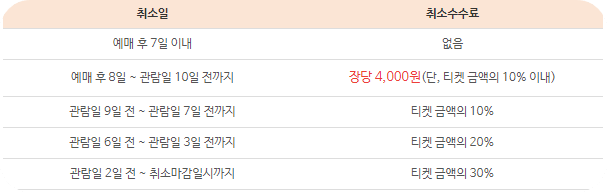 부산불꽃축제 취소 수수료는 위의 표와 같습니다. 단, 부산불꽃축제 티켓이 배송된 이후에는 인터넷을 통한 취소가 불가능하며, 취소 마감 시간인 11월 8일 17:00 이전에 티켓이 예스24 티켓 고객센터로 반송되어야 취소가 가능합니다. 취소 수수료는 도착일 기준으로 부과되며, 배송료는 환불되지 않습니다.