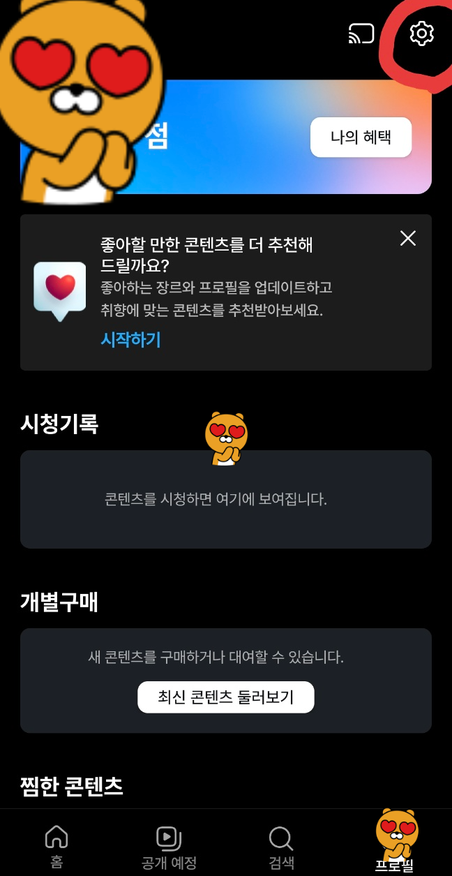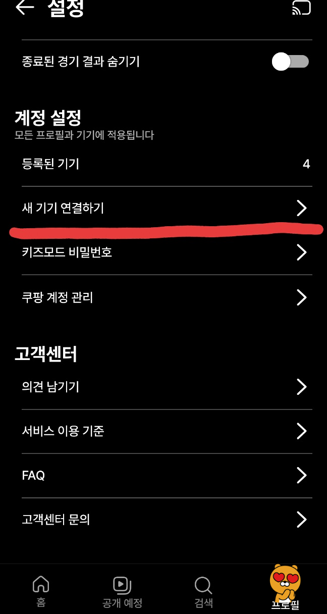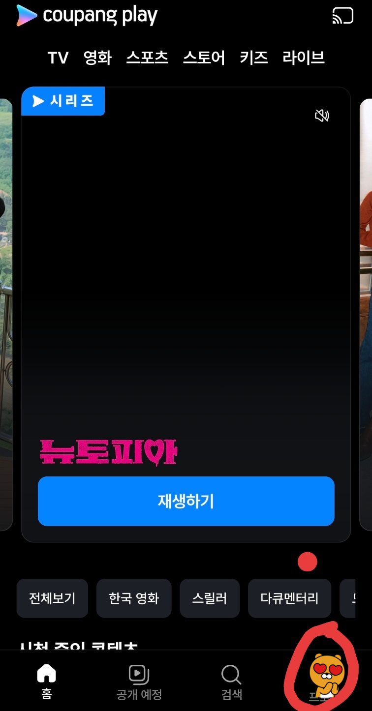 5) 모바일 앱 실행: 핸드폰에서 쿠팡플레이 앱을 실행하고, 하단의 프로필로 들어갑니다.