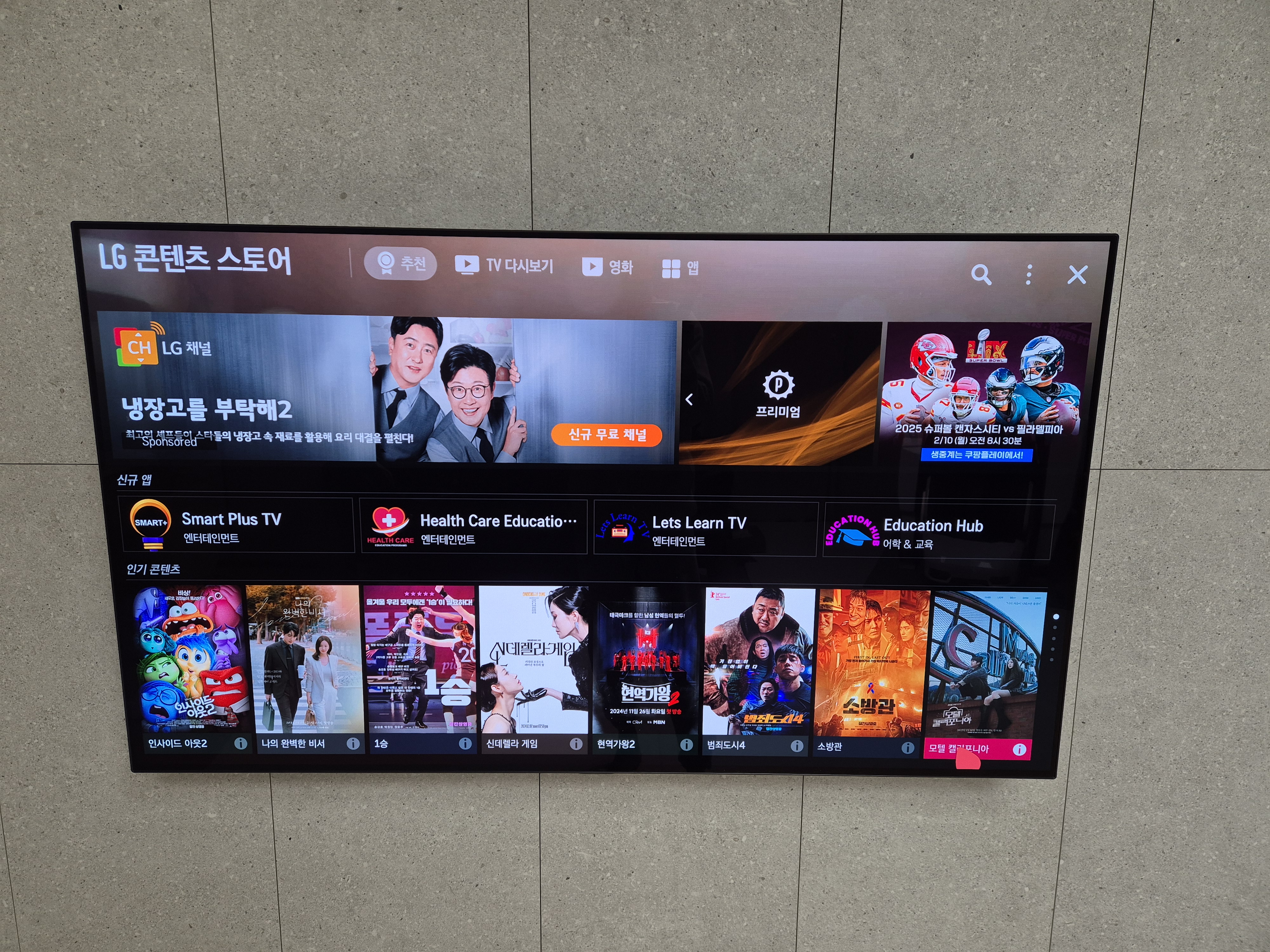 2) 앱스토어 열기: 리모컨에서 [홈] 버튼을 눌러 TV의 앱스토어로 들어갑니다. 저희집은 LG TV라 LG콘텐츠 스토어로 접속했습니다.