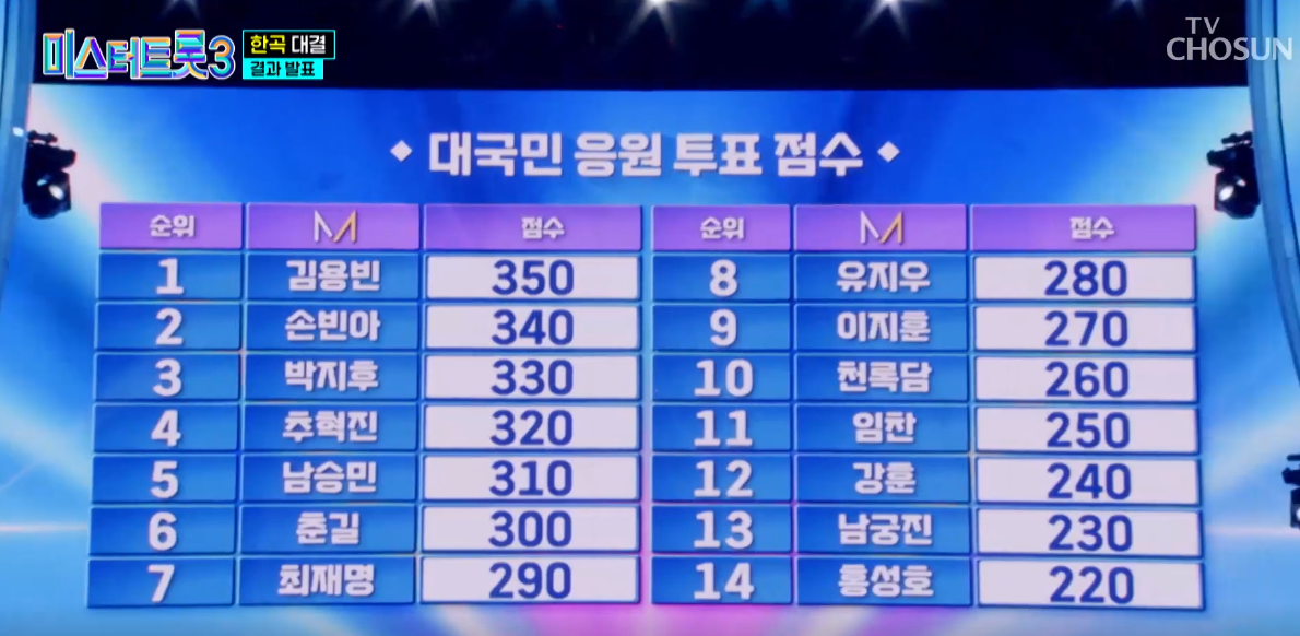 2. 김용빈, 응원 투표 강세로 여전한 우승 후보!