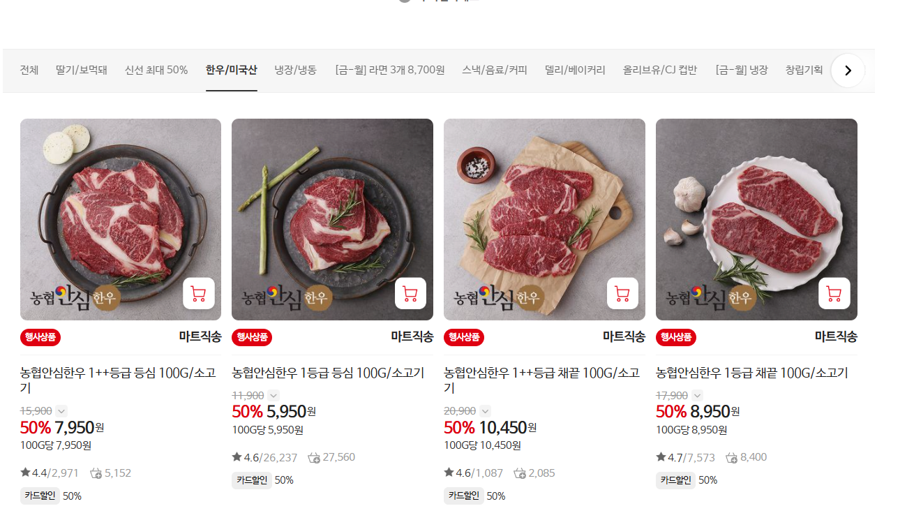- 농협안심한우: 50% 할인 (행사카드 결제 시)