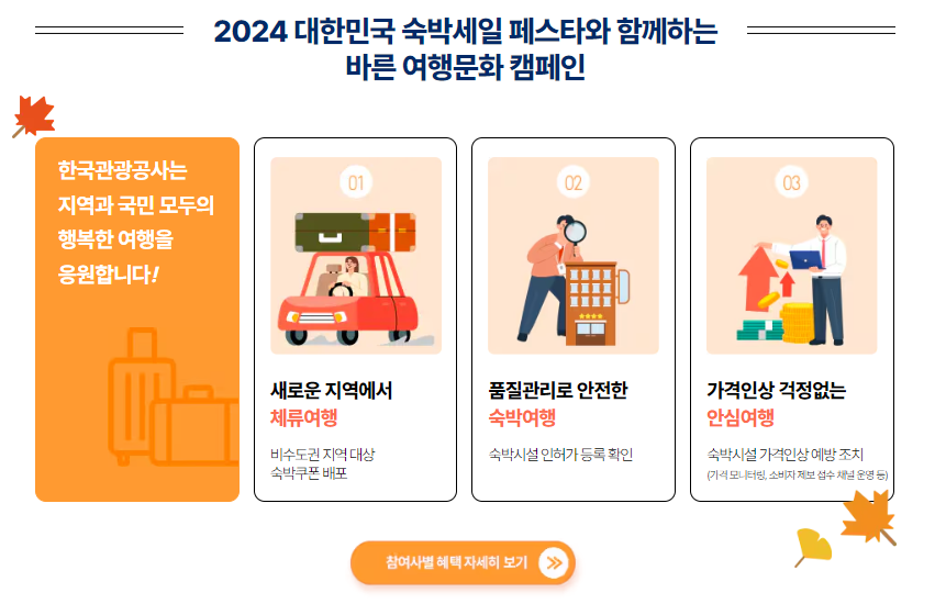 2024년 추석 연휴 기간 동안에 사용할 수 있는 숙박세일페스타에 대한 정보를 정리해 보겠습니다. 할인 쿠폰은 정해진 수량 만큼만 매일 선착순 발행한다고 하니 한정수량이 마감되기 전에 서둘러 쿠폰을 다운로드 받으세요!