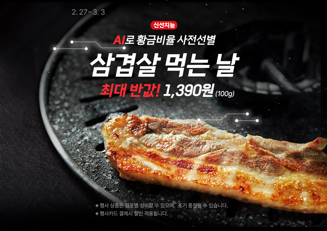 - 롯데백화점: 제주돼지 삼겹살 50% 할인, 브랜드 삼겹살 40% 할인 (3월 4일까지)