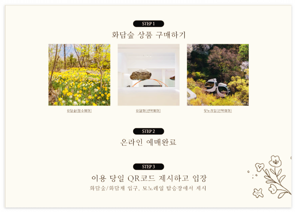 2) 화담채와 모노레일을 이용하려면 먼저 입장권 예약하기를 통해 꼭 구매해야 해요.