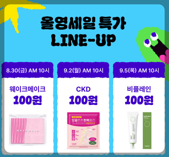 특가 상품도 있습니다. 9월 2일(월) 오전 10시에는 CKD 제품을 100원에, 9월 5일(목) 오전 10시에는 비플레인을 100원에 판매한다고 하니 알람 꼭 맞춰두세요~ 100원이면 거의 공짜 아닌가요?