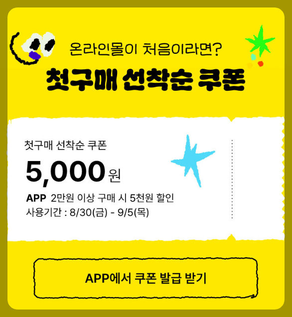 8월 30일부터 9월 5일까지 온라인 첫구매 선착순 쿠폰을 발급하고 있습니다. 2만원 이상 구매 시 5천원을 할인해 준다고 하니 아래 링크에서 앱을 다운로드 받고 쿠폰을 발급받아 보세요!