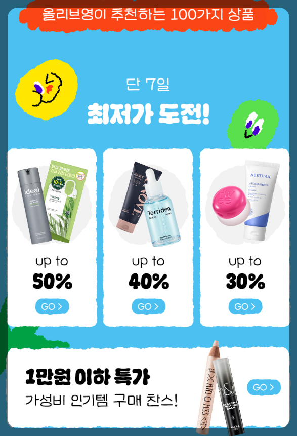 이번 할인에서는 올리브영이 추천하는 100개 상품 특가를 진행합니다. 50%, 40%, 30%별 할인상품이 있고 1만원 이하 가성비템을 추천하고 있으니 아래 홈페이지에서 할인 상품을 확인해 보세요.