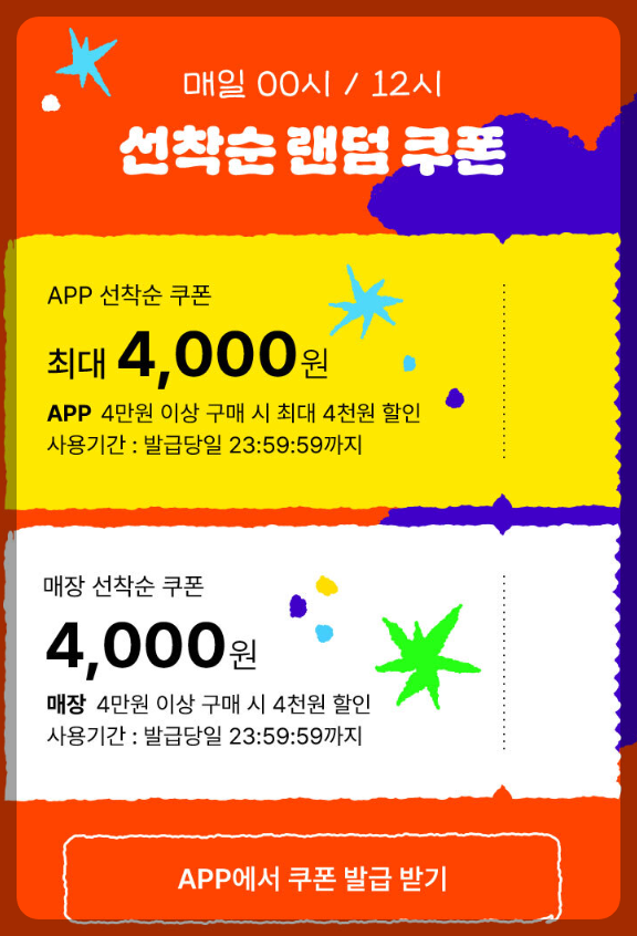 이번 할인기간 동안 특별 이벤트로 매일 00시와 12시에 앱 선착순 쿠폰과 매장 선착순 쿠폰을 발급합니다. 할인 기간에 쿠폰까지 받으면 정말 최저가로 구입이 가능할 것 같은데요? 앱 선착순 쿠폰은 4만원 이상 구매시 최대 4천원 할인되고, 매장 선착순 쿠폰은 4만원 이상 구매시 4천원 할인이 된다고 하니 꼭 앱 다운로드 받으시고 쿠폰을 발급받으세요!