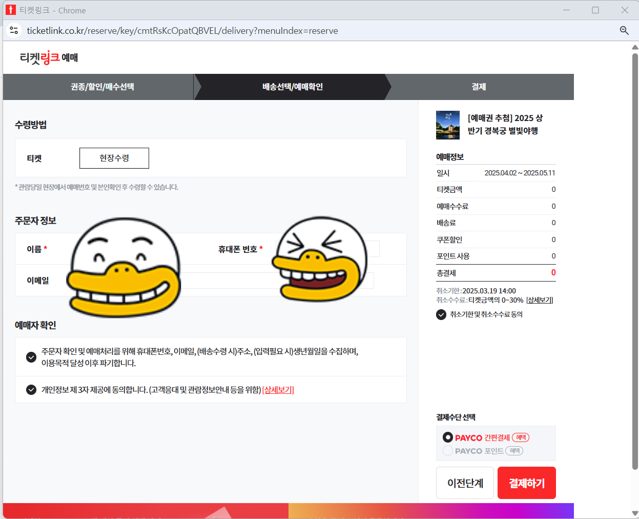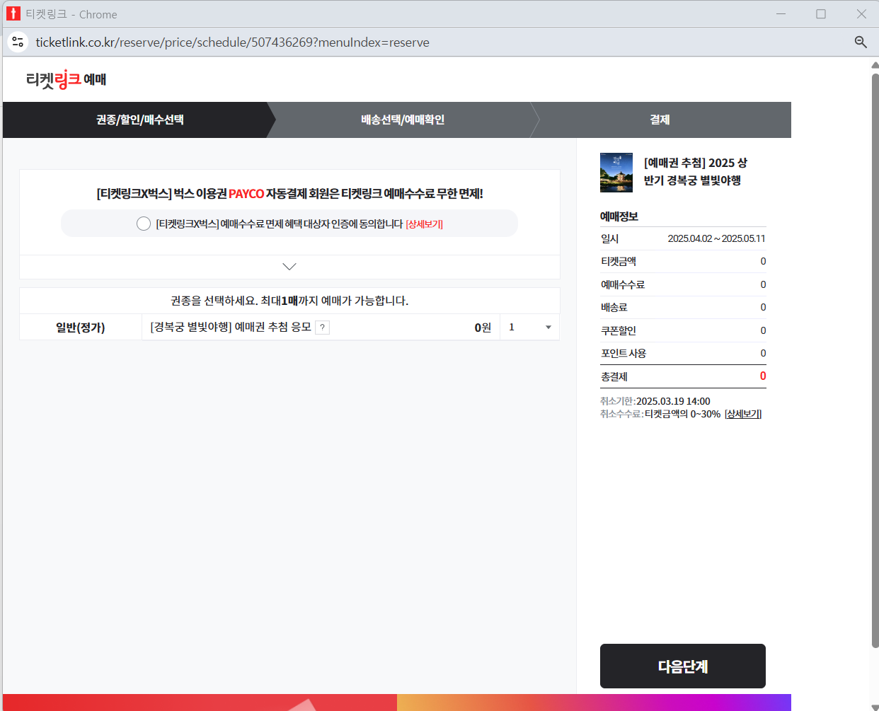 4) 인터넷 예매 진행: 결제하기 버튼을 누르고 결제 진행(0원)하면 되요. 인터넷 예매 단계에서는 실제 결제가 이루어지지 않아요.