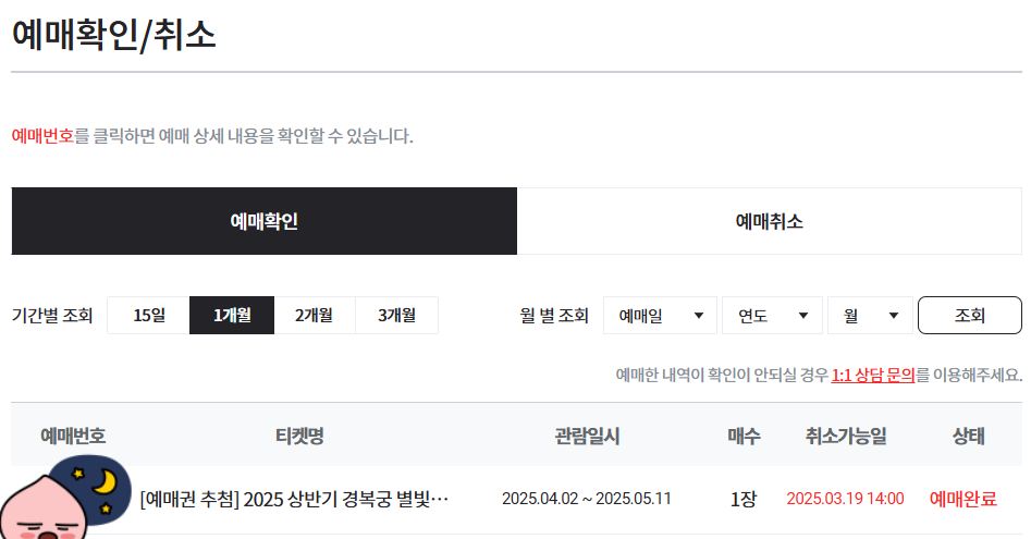 3. 경복궁 야간개장(별빛야행) 인터넷 예매 추첨 결과 확인 방법