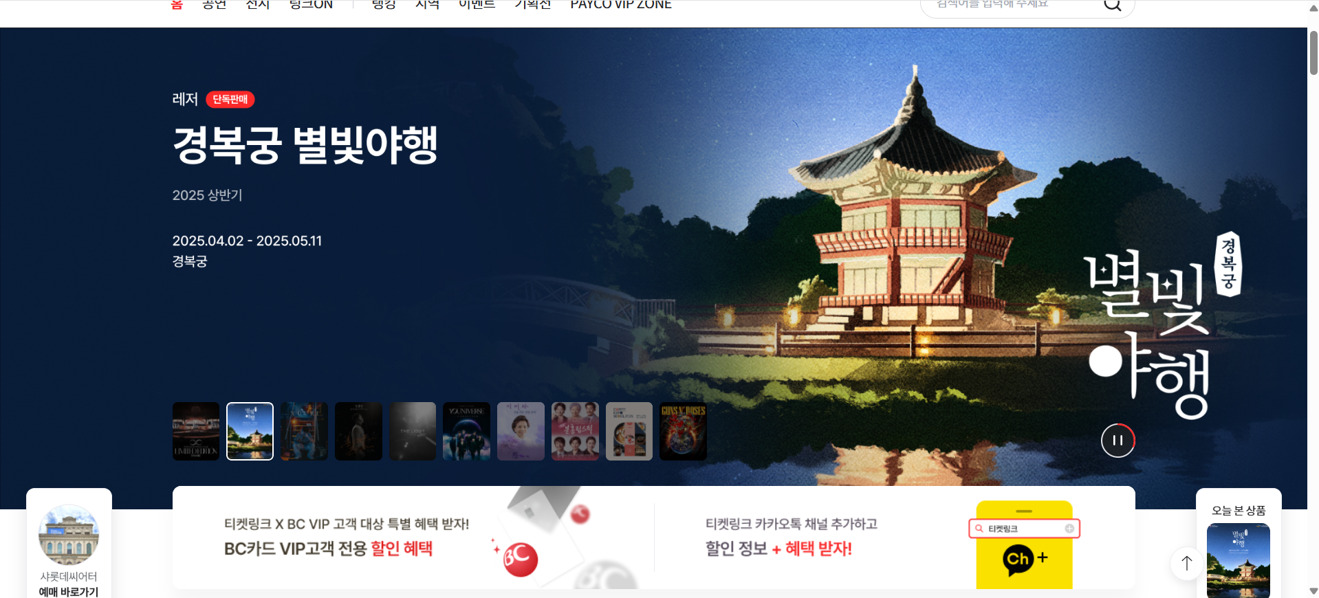 1) 경복궁 야간개장(별빛야행) 예매 페이지 접속: 티켓링크 웹사이트에서 '경복궁 별빛야행' 예매 페이지를 찾아 접속하세요.