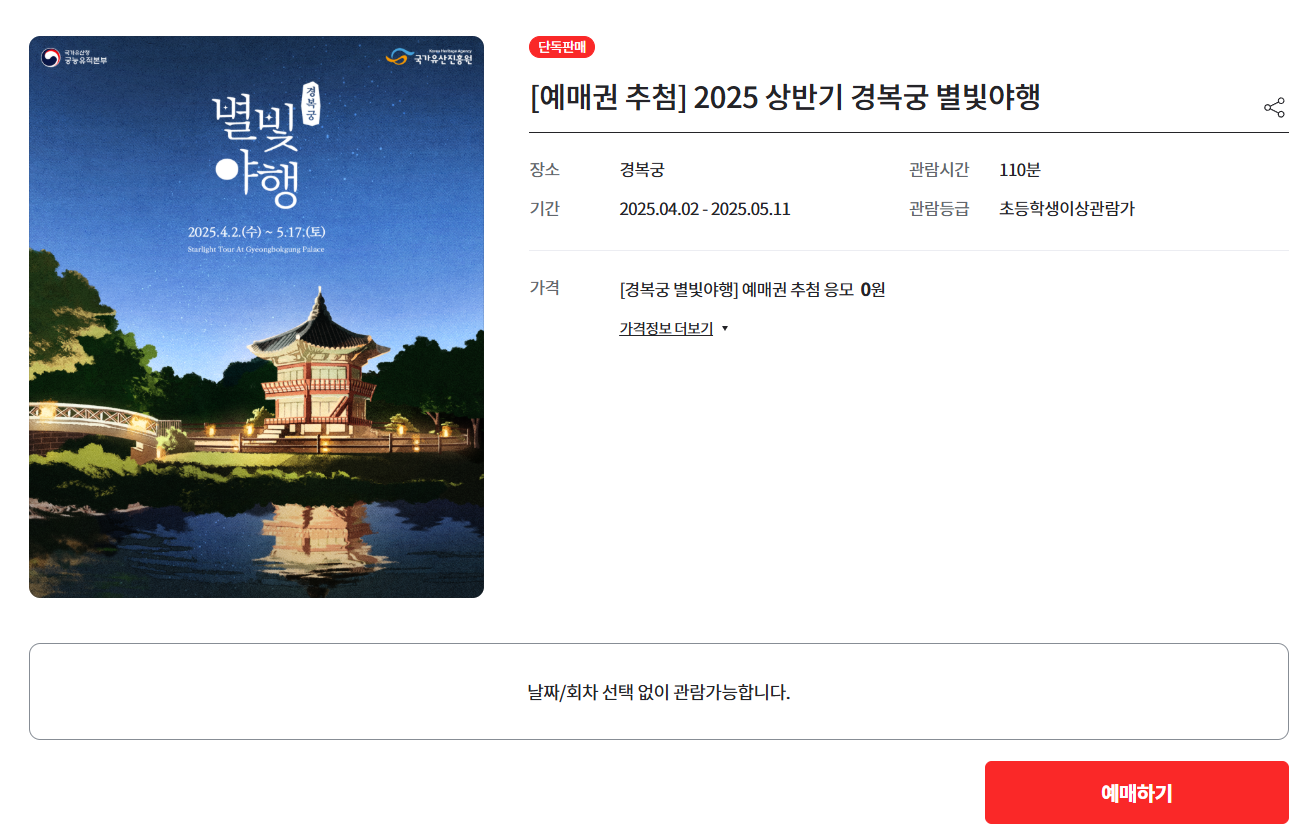 2) 인터넷 예매 기간 확인: 경복궁 별빛야행 인터넷 예매 기간(2025년 3월 13일 14:00 ~ 3월 19일 14:00)은 까지이니 꼭 확인해야 해요.